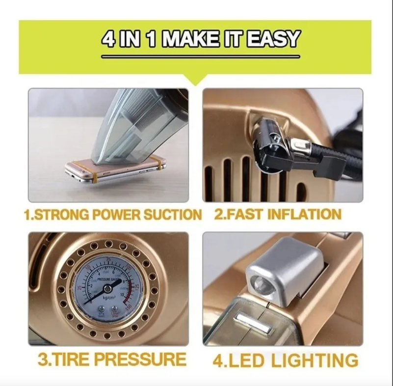 Aspiradora de Mano 4 en 1 para carro — aspira, infla, sopla y más